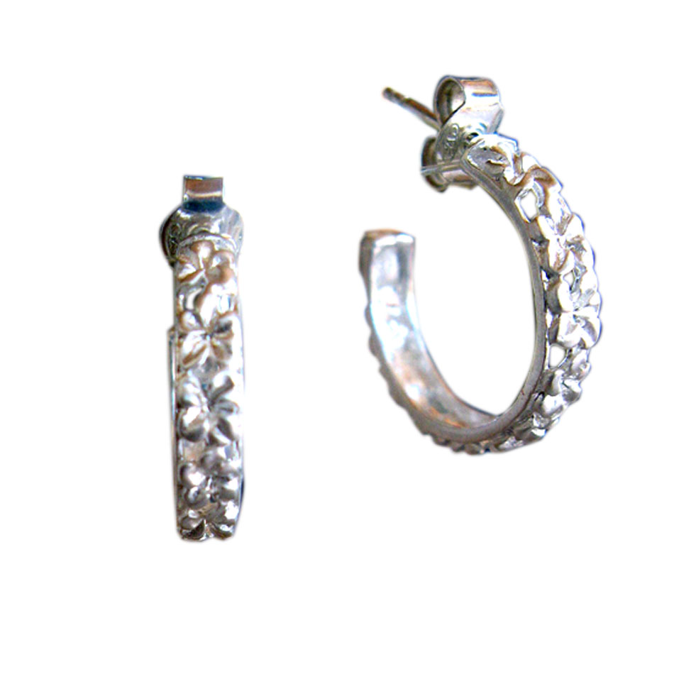 Silbercreole mit floralen Motiven. Ca. 4mm b breit, Durchmesser ca. 18 mm mehr